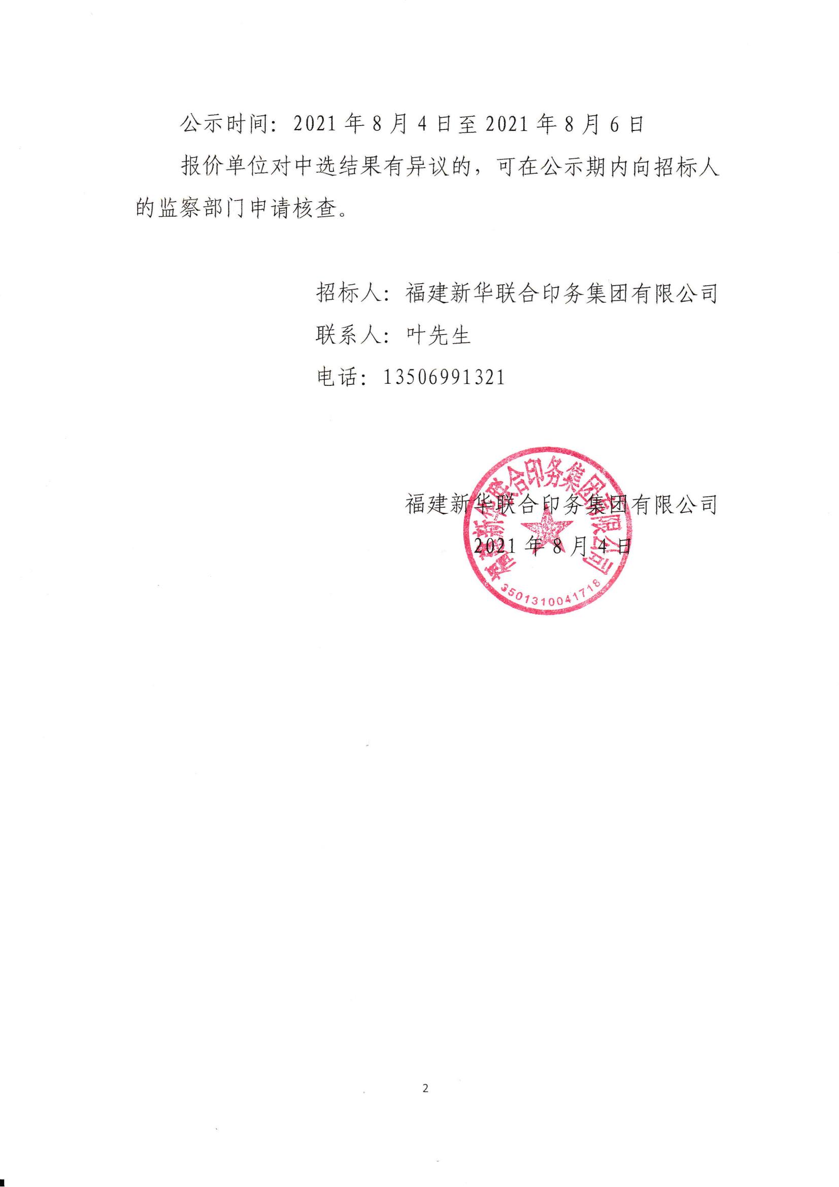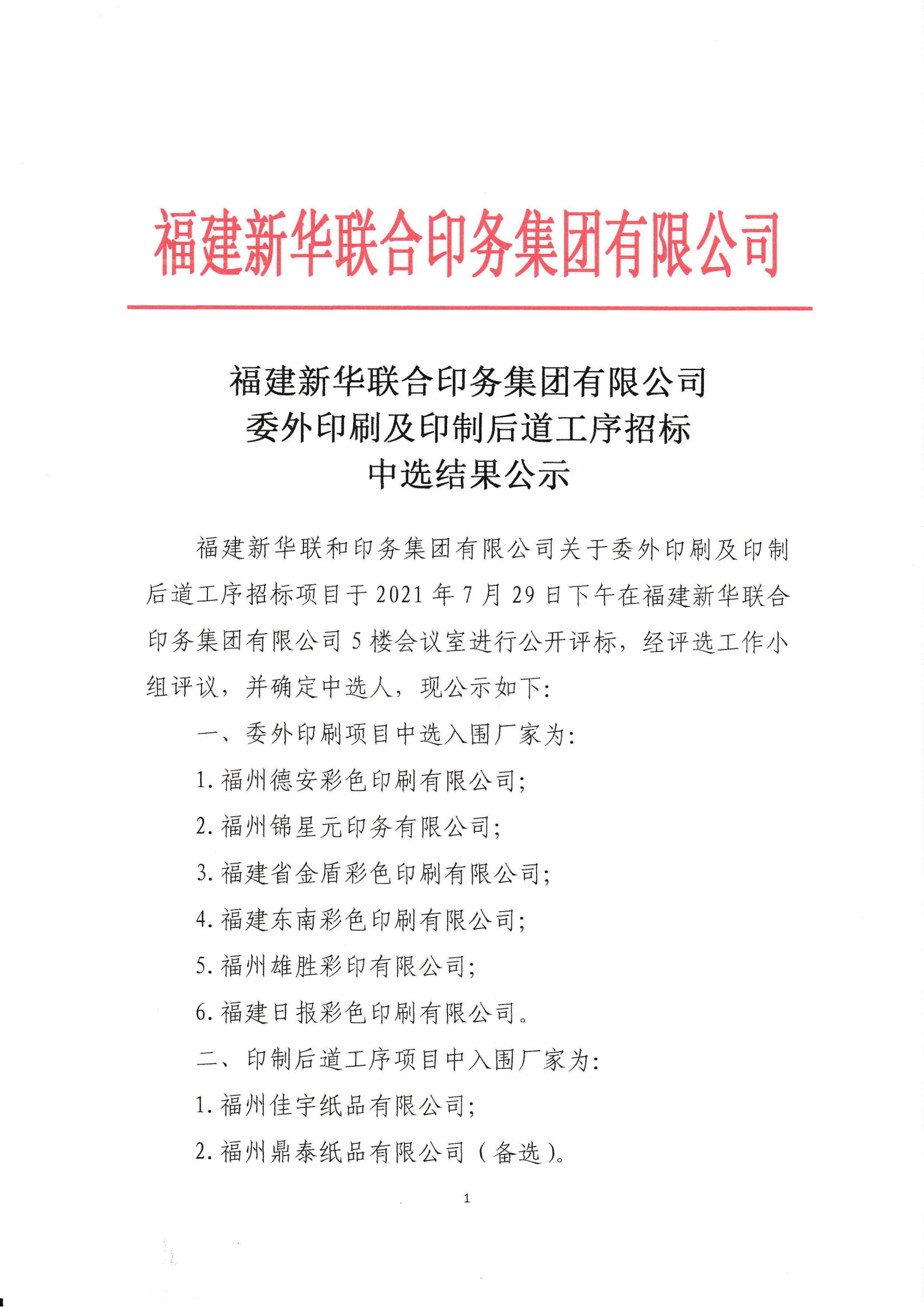 fun88有限公司关于委外印刷及印制后道工序招标项目于2021年7月29日下午在福建新华联合 印务集团有限公司5楼会议室进行公开评标,经评选工作小组评议,并确定中选人,现公示如下: