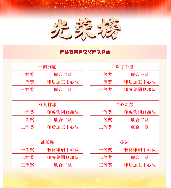 本次运动会共有6支代表队伍参赛,分别是:印务集团总部队;由印前制作中心、储运中心、机电服务中心共同组成的联合一队;由华彩印务公司、出版物资公司共同组成的联合二队;由精品印刷中心、恒源光电公司共同组成的联合三队;教材印刷中心队;印后加工中心队。