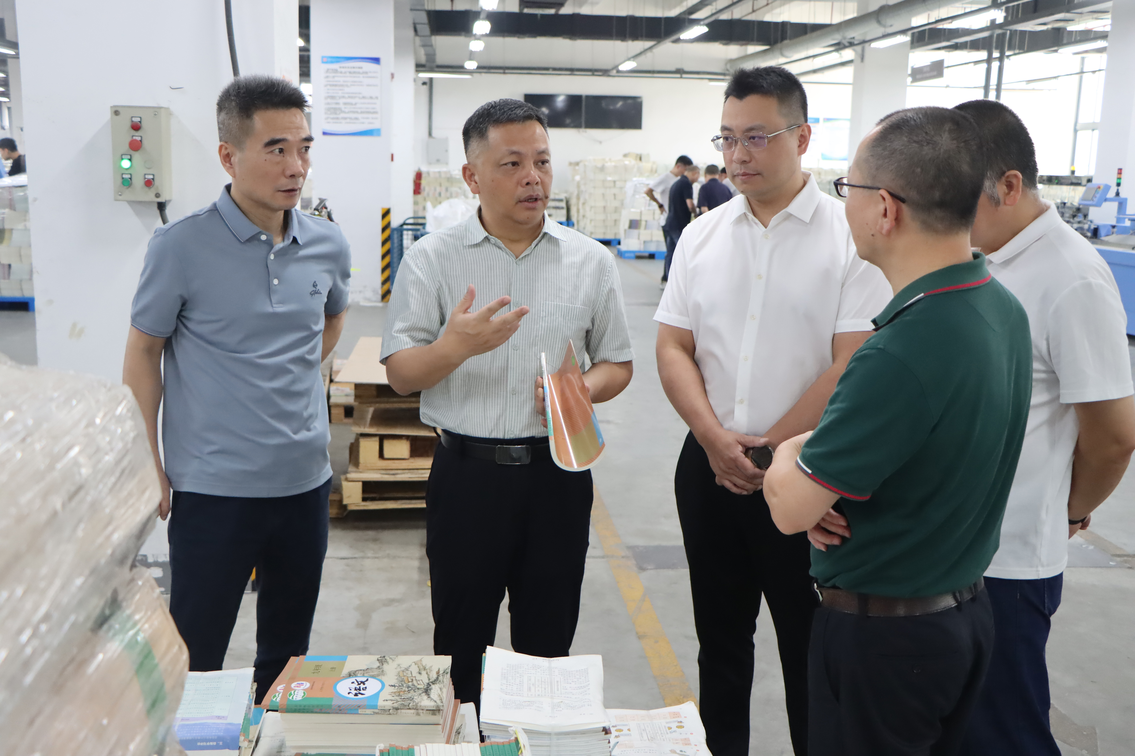 会前,谢兴权一行深入车间实地调研2024年秋季教材教辅印制工作。由于今年秋季教材有效生产周期较去年大幅缩减,时间紧、任务重,质量标准严、社会关注度高,给印制工作带来严峻挑战。印务集团加强资源统筹、人员协作、产能调度,持续提产能、优质量、保安全,带领职工加班加点、夜以继日,用心用情用力打造精品教材。谢兴权详细了解了2024年秋季教材印制工作开展情况,对大家的辛苦付出表示肯定与感谢,反复叮嘱大家在坚决落实政治任务,确保在规定时间内完成秋季教材印制任务的同时,要做好高温天气下一线员工防暑降温工作,注重劳逸结合,确保以健康的身体状况来高效完成政治任务。